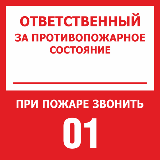Ответственный при пожаре – лицо, от которого зависит проведение противопожарных мероприятий и координация действий людей в случае пожара. Размещение таблички «Ответственный, при пожаре звонить 01» – обязательное требование правил пожарной безопасности НБП 105-2003.