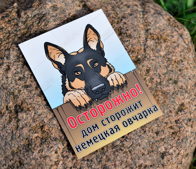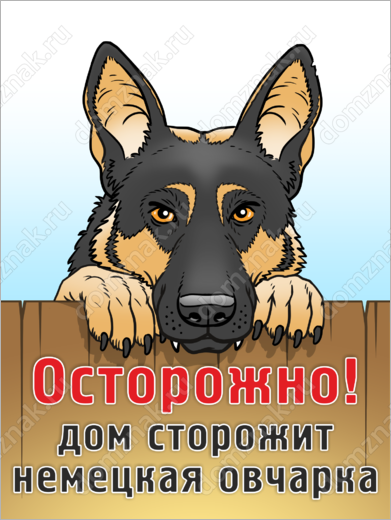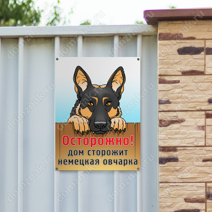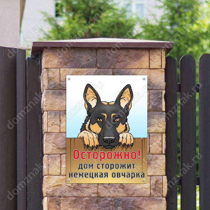 Если вашу территорию охраняет опасный пес, тогда рекомендуем вам разместить на ее ограждении табличку «Дом сторожит немецкая овчарка». Она предупредит нежданных гостей о том, что заходить за ограждение без хозяев нее рекомендуется, и снизит вероятность посягательства преступников на нажитое непосильным трудом имущество.