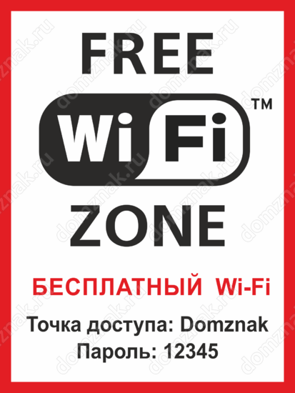 Расположите в магазине, торговом центре или любом другом общественном заведении табличку «Wifi free zone». Она подскажет окружающим, что здесь можно воспользоваться бесплатной беспроводной связью. На нее нанесен крупный знак Wi-Fi, который хорошо различим с большого расстояния, название точки доступа и пароль. Красная рамка таблички приковывает внимание и хорошо сочетается с общей цветовой гаммой изделия.