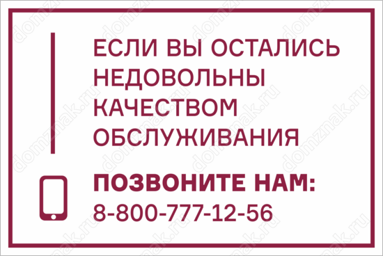 Оборудуйте общественное заведение табличкой «Позвоните, если не довольны качеством обслуживания». Благодаря ей каждый посетитель сможет выразить свое недовольство обслуживающим персоналом, а вы сможете значительно улучшить сервис. Для оперативной связи на табличку нанесен телефонный номер и векторное изображение мобильного телефона.