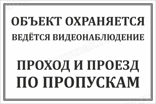 Табличка «Объект охраняется проход и проезд по пропускам» изготавливается на основе из пластика ПВХ или оцинкованного металла.