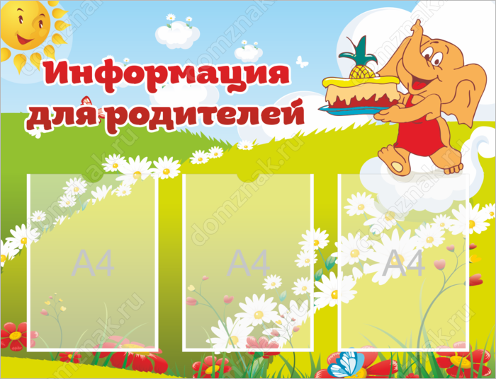 Невероятно милый информационный стенд с изображением красочной цветочной полянки и веселого слоника придется по душе не только деткам, но и родителям. Разместить его можно в детском саду или в классе начальной школы. Три вертикальных кармана формата А4 помогут донести всю необходимую информацию об учебном процессе, успехах детей и приближающихся мероприятиях.