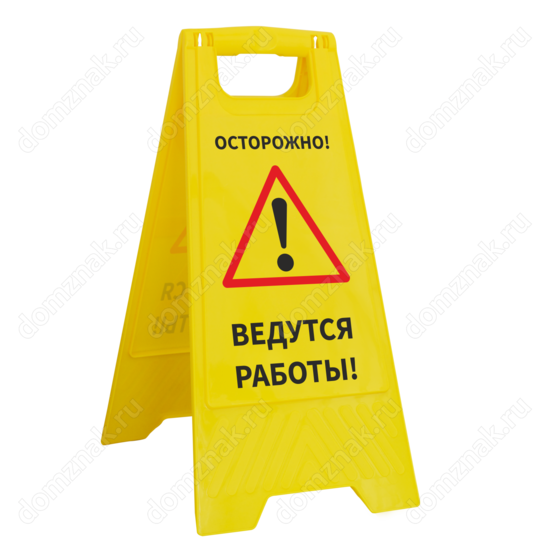 Установите раскладную предупреждающую табличку «Осторожно, ведутся работы» на месте проведения работ любого характера. Она размещается на полу, раскладываясь словно домик. Имеет удобную ручку для перемещения с места на место. Выполнена из ударопрочного пластика и порадует надежной конструкцией. Ярко-желтый цвет привлекает всеобщее внимание, а контрастная надпись большим шрифтом читаема даже с дальнего расстояния. Надпись усиливает предупреждающий знак.