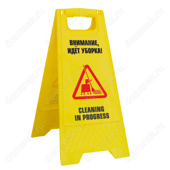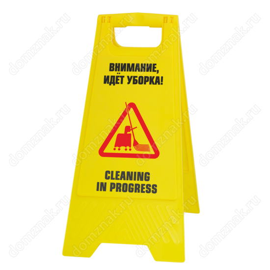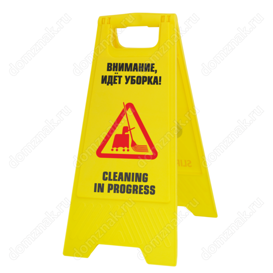 Установите табличку на пол «Идет уборка» во время проведения уборочных работ в офисном, торговом или другом общественном помещении. Ее насыщенный желтый цвет привлекает внимание, а контрастная надпись и яркое изображение хорошо просматриваются даже с большого расстояния. Надпись выполнена на русском и английском языках, что позволяет устанавливать табличку даже в заведениях, принимающих иностранцев. Табличка имеет устойчивую складную конструкцию и компактные размеры.