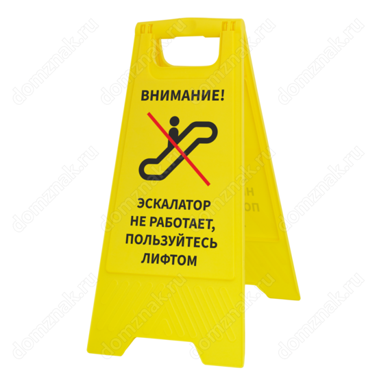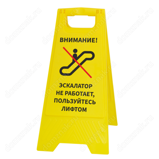 Если в вашем заведении имеется эскалатор, тогда вам обязательно понадобится табличка на пол «Эскалатор не работает, пользуйтесь лифтом». Она имеет прочную складную конструкцию и удобную ручку для перемещения. Ее яркий желтый цвет привлекает внимание, а контрастные черные надписи хорошо видны даже с большого расстояния. Предупреждение подкреплено наглядным рисунком, который усиливает восприятие информации.