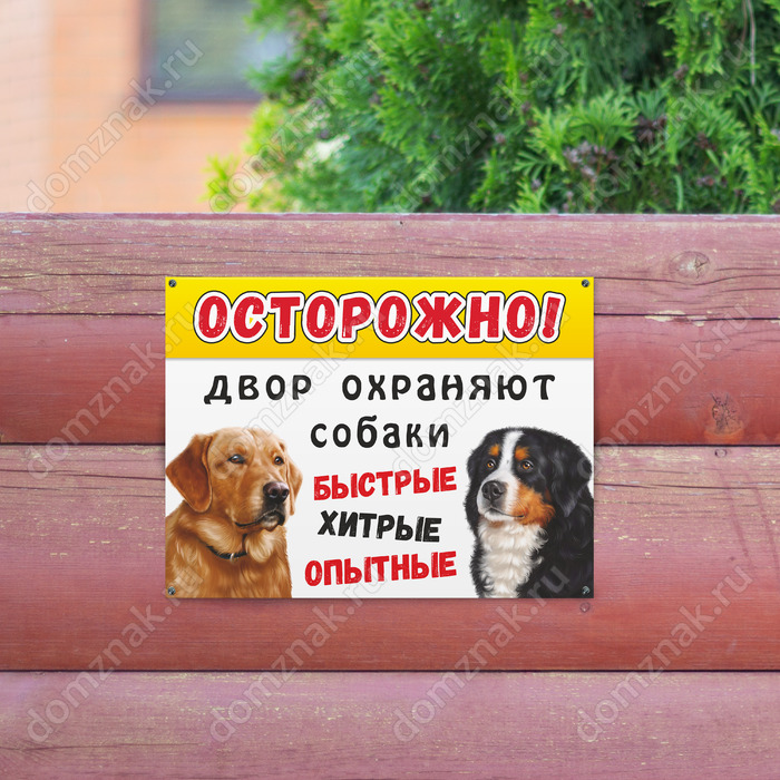 Предупредите окружающих, что ваш двор охраняют хитрые, быстрые и опытные собаки, а потому незаметно проникнуть внутрь никак не получится. Табличка «Осторожно, двор охраняют собаки» содержит изображения двух собак и предупреждающую надпись, которая видна с большого расстояния. Расположите ее у входа во двор или по периметру охраняемой территории.