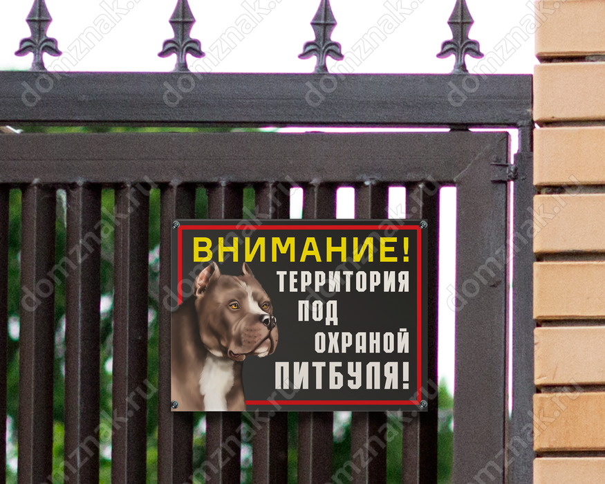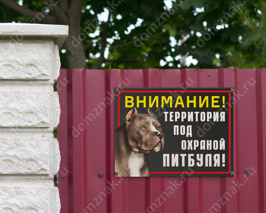 Вашу территорию охраняет опасный пес? В таком случае вам не обойтись без таблички «Территория под охраной питбуля». Она проинформирует окружающих о том, с кем им придется встретиться, если проникнуть на объект без уведомления хозяина. Табличка имеет устрашающий дизайн с изображением собаки и яркими, привлекающими внимание надписями.