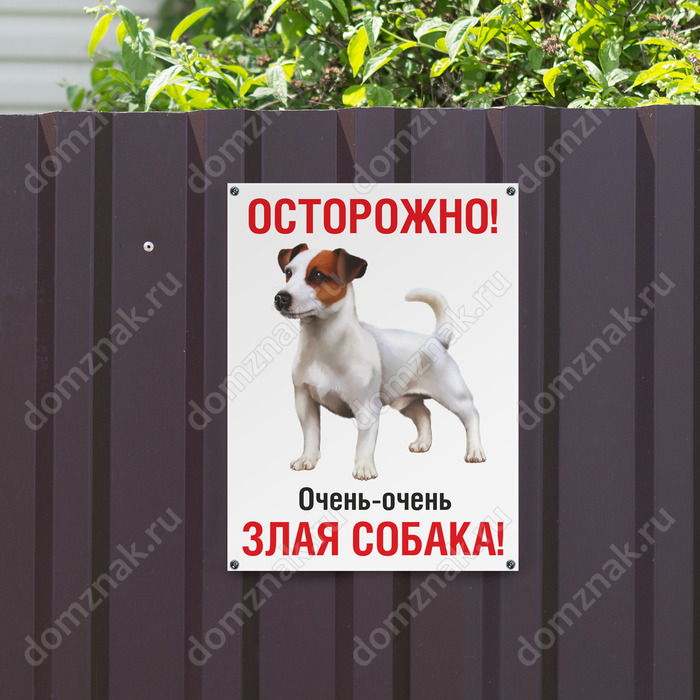 Табличка «Очень злая собака» джек-рассел-терьер изготавливается на основе из пластика ПВХ или оцинкованного металла.