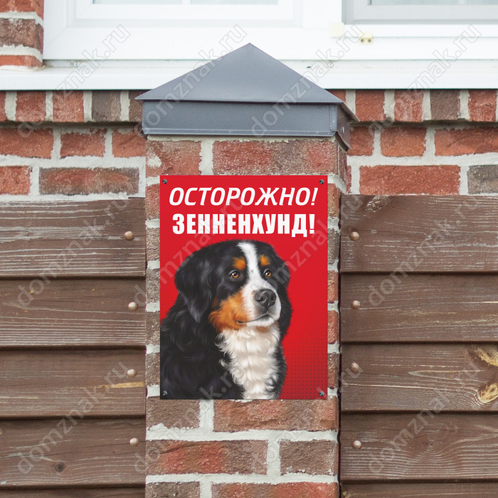 Разве можно не заметить табличку «Осторожно, зенненхунд»? Благодаря красному цвету она будет бросаться в глаза всем проходящим мимо вашего двора. Изображение собаки породы зенненхунд усилит послание, которое нанесено контрастными и большими буквами. Установите такую табличку на заборе или стене вашего дома и будьте спокойны за свое имущество.