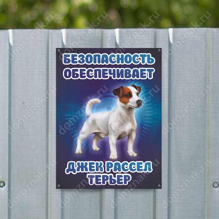 Табличка «Безопасность обеспечивает джек-рассел-терьер» изготавливается на основе из пластика ПВХ или оцинкованного металла.