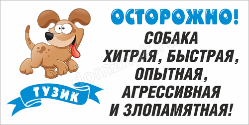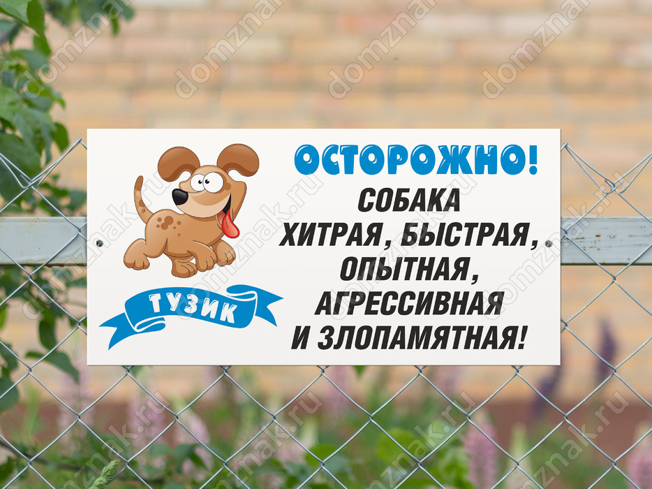 Предупредите окружающих, что за ограждением находится быстрая, опытная, хитрая, агрессивная и злопамятная собака. И она готова вцепиться в того, кто незаконно проникнет на территорию. Эта табличка «Тузик» порадует своим «легким» дизайном, контрастной надписью и мультяшным изображением собаки.
