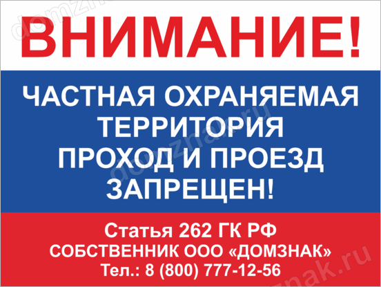 Табличка «Частная охраняемая территория, проход и проезд запрещен» изготавливается на основе из пластика ПВХ или оцинкованного металла.