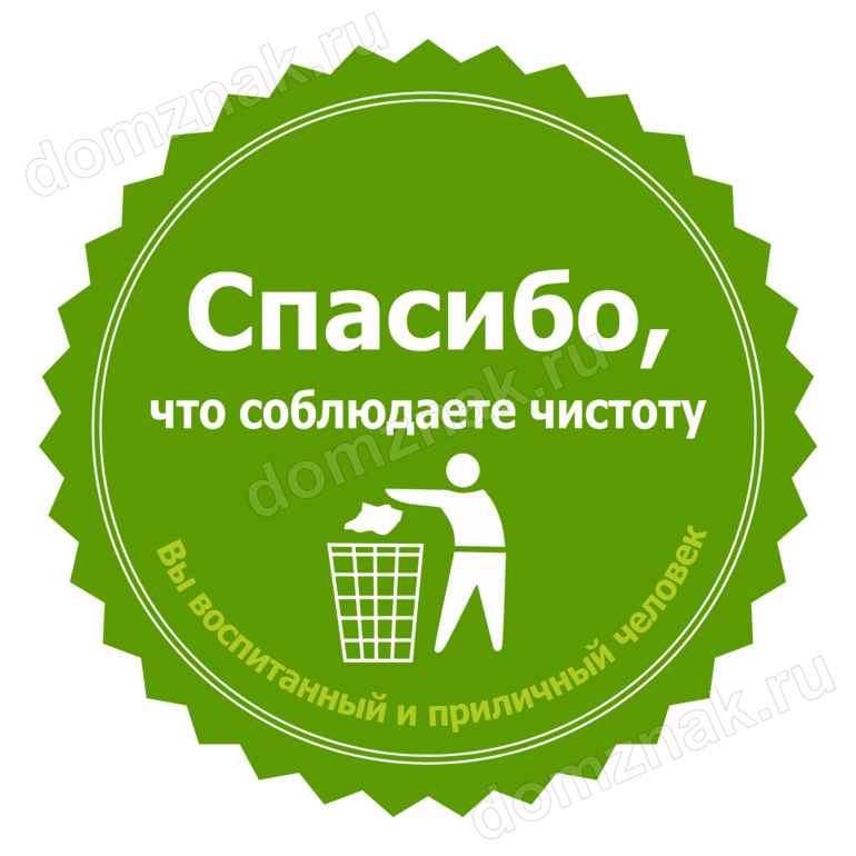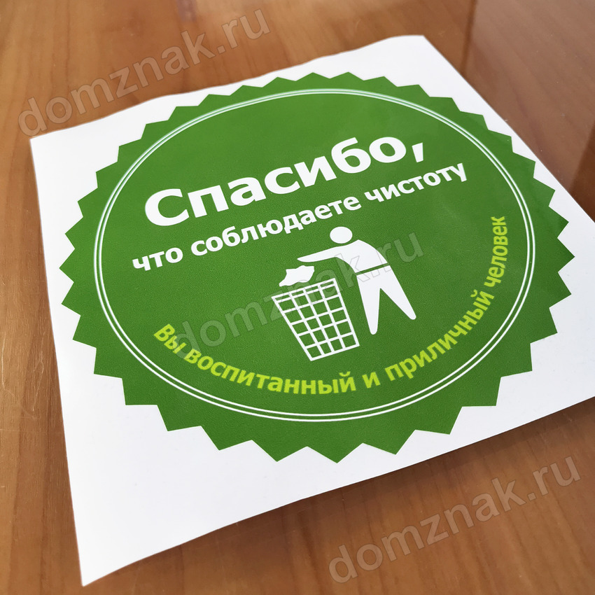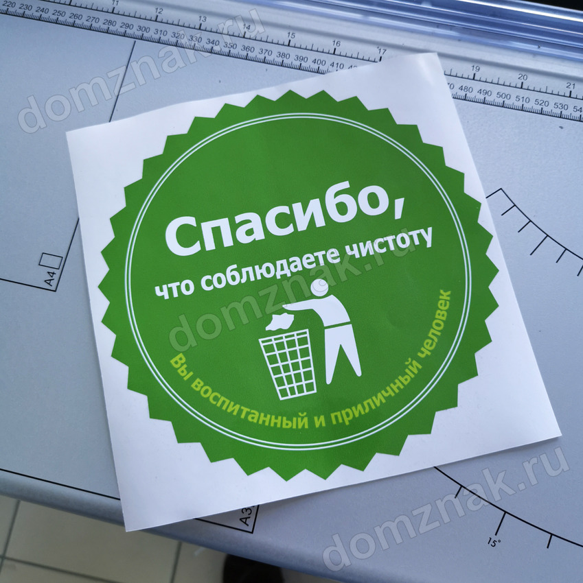 Наклейка «Спасибо, что соблюдаете чистоту» изготавливается из матовой виниловой плёнки. Толщина наклейки 160 мкм, что позволяет легко наклеить ее на любую ровную поверхность без образования пузырей воздуха и складок.