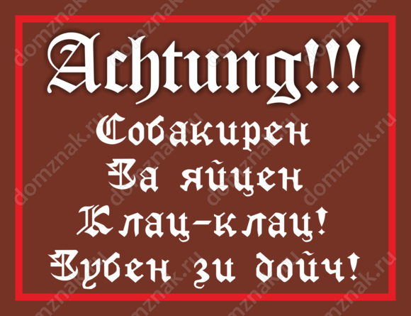 Табличка «Ахтунг! Собакирен за яйцен клац-клац!» изготавливается на основе из пластика ПВХ или оцинкованного металла.