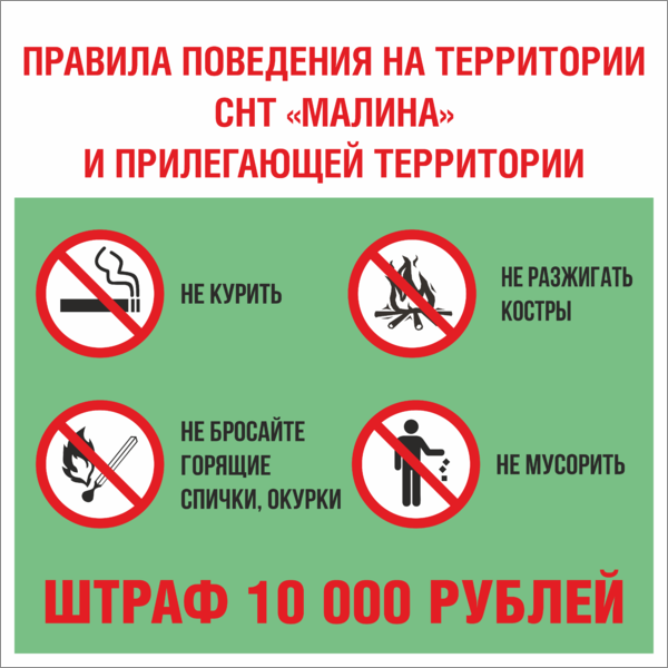Табличка «Правила поведения на территории СНТ» изготавливается на основе из пластика ПВХ или оцинкованного металла.