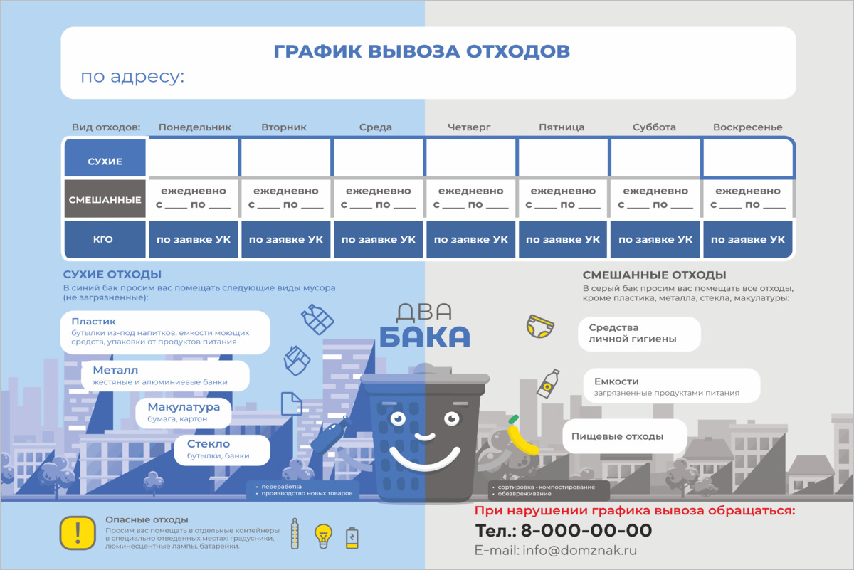 Табличка «График вывоза отходов» изготавливается на основе из пластика ПВХ или оцинкованного металла.
