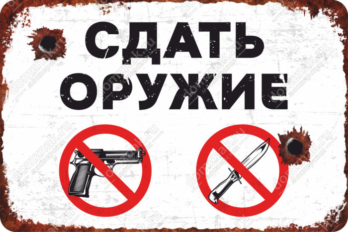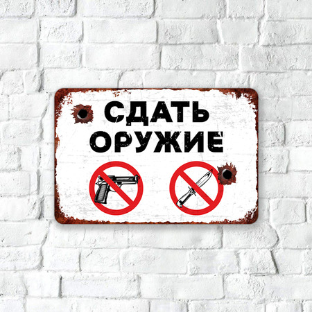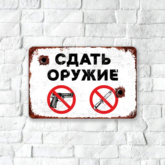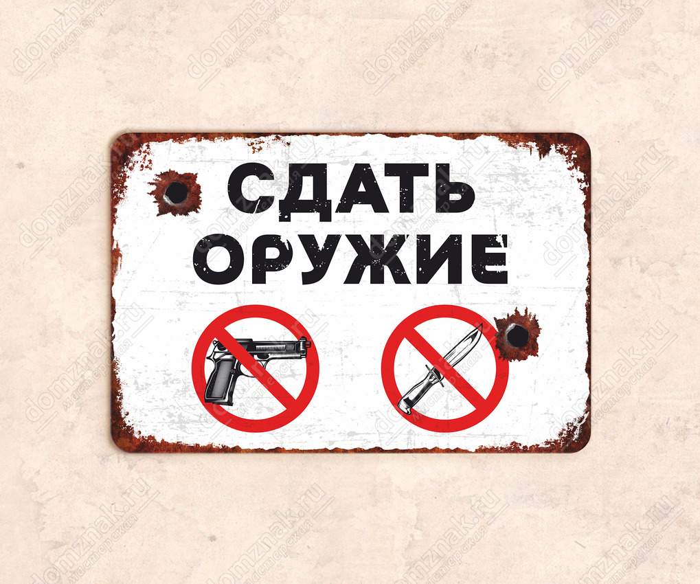 Табличка «Сдать оружие» изготовлена из пластика ПВХ, толщиной 4 мм. Изображение наносится по технологии УФ-печати. Табличка предназначена для использования как в помещении, так и на улице.