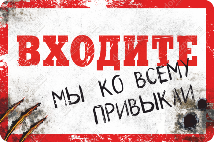 Табличка «Входите. Мы ко всему привыкли» изготовлена из пластика ПВХ, толщиной 4 мм. Изображение наносится по технологии УФ-печати. Табличка предназначена для использования как в помещении, так и на улице.