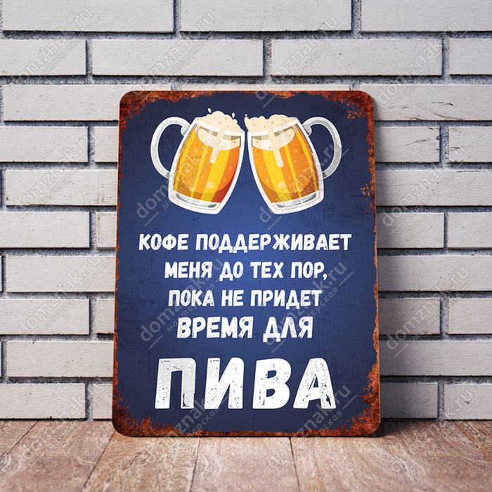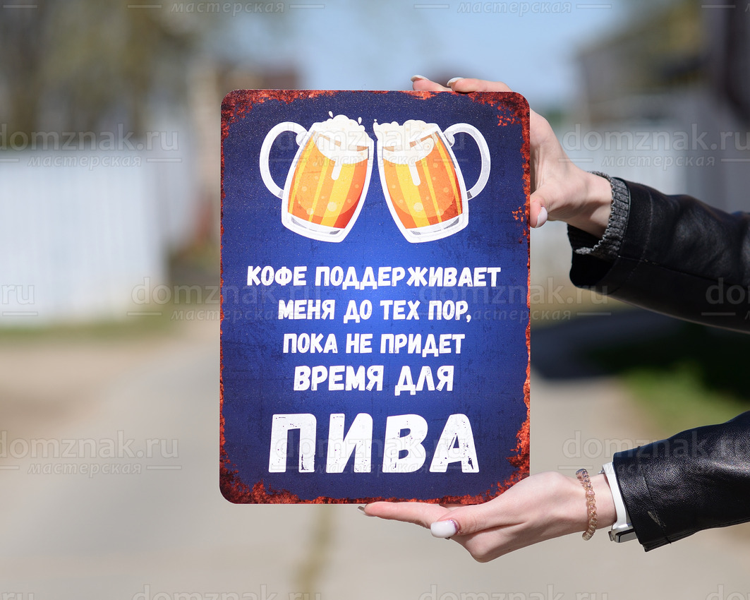 Табличка «Кофе поддерживает меня до тех пор, пока не придет время пива» изготовлена из пластика ПВХ, толщиной 4 мм. Изображение наносится по технологии УФ-печати. Табличка предназначена для использования как в помещении, так и на улице.