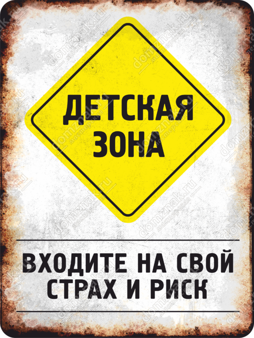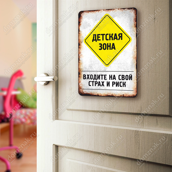 Табличка «Детская зона. Входите на свой страх и риск» изготовлена из пластика ПВХ, толщиной 4 мм. Изображение наносится по технологии УФ-печати. Табличка предназначена для использования как в помещении, так и на улице.