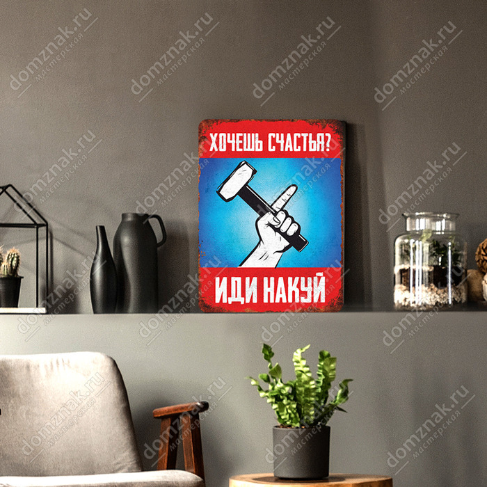 Таблички «Хочешь счастья? Иди накуй!» изготовлена из пластика ПВХ, толщиной 4 мм. Изображение наносится по технологии УФ-печати. Табличка предназначена для использования как в помещении, так и на улице.