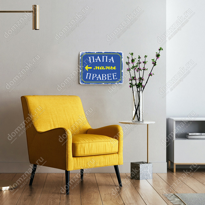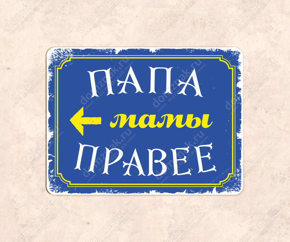 Табличка «Папа мамы правее» изготовлена из пластика ПВХ, толщиной 4 мм. Изображение наносится по технологии УФ-печати. Табличка предназначена для использования как в помещении, так и на улице.