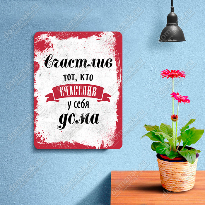 Табличка «Счастлив тот, кто у себя дома» изготовлена из пластика ПВХ, толщиной 4 мм. Изображение наносится по технологии УФ-печати. Табличка предназначена для использования как в помещении, так и на улице.