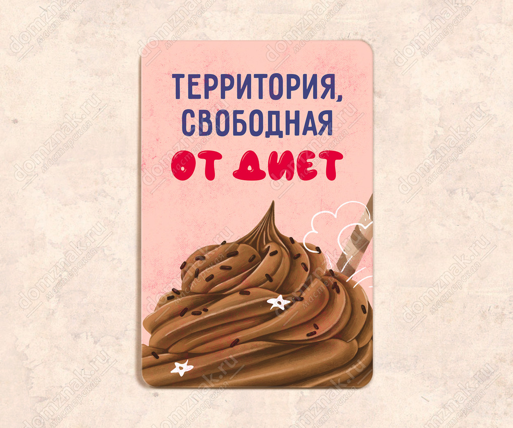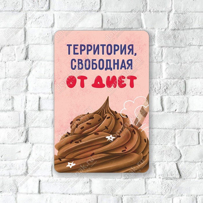 Табличка «Территория, свободная от диет» изготовлена из пластика ПВХ, толщиной 4 мм. Изображение наносится по технологии УФ-печати. Табличка предназначена для использования как в помещении, так и на улице.