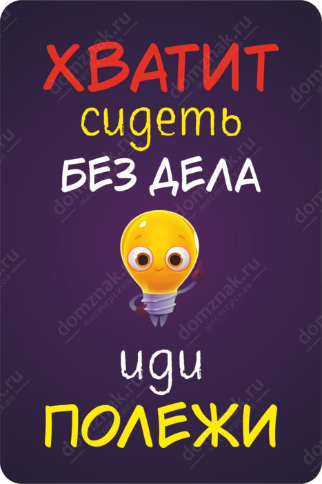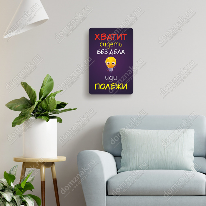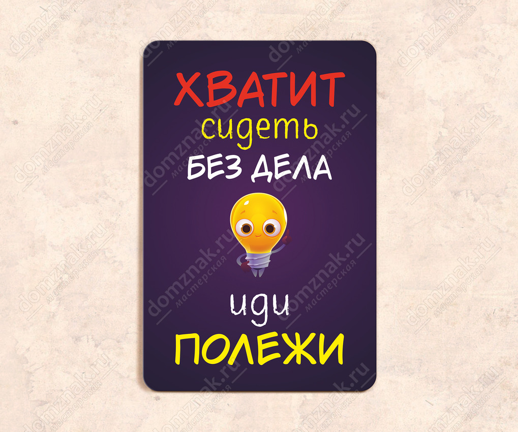 Табличка «Хватит сидеть без дела, иди полежи» изготовлена из пластика ПВХ, толщиной 4 мм. Изображение наносится по технологии УФ-печати. Табличка предназначена для использования как в помещении, так и на улице.