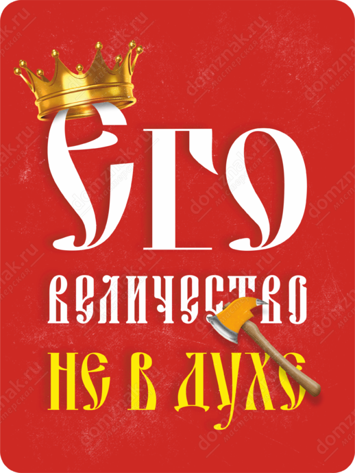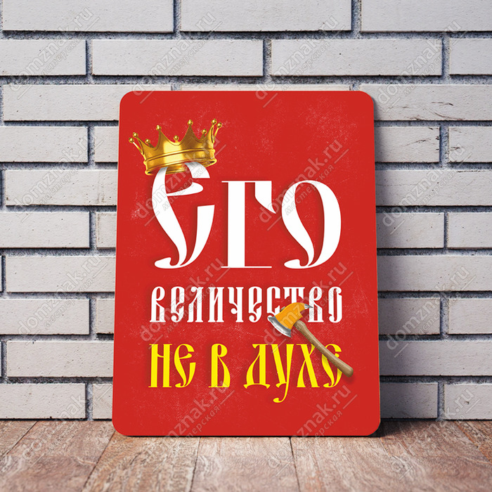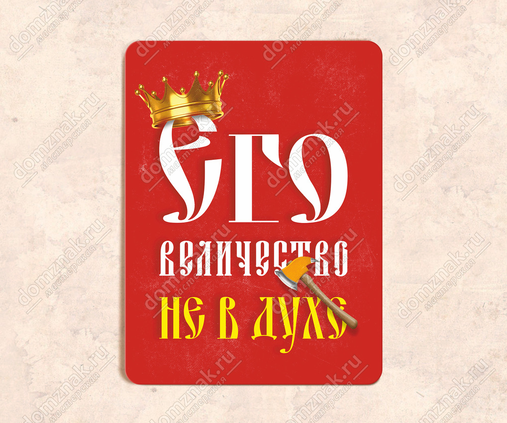 Табличка «Его величество не в духе» изготовлена из пластика ПВХ, толщиной 4 мм. Изображение наносится по технологии УФ-печати. Табличка предназначена для использования как в помещении, так и на улице.