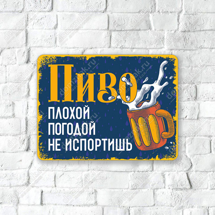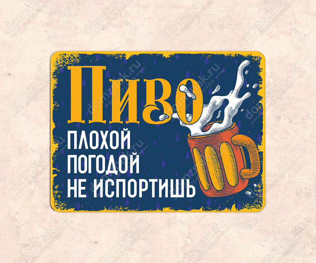 Для баров, кафе и пабов оригинальные таблички – стильный акцент интерьера, который подчеркивает тип заведения. Прикольная табличка «Пиво плохой погодой не испортишь» не оставит никаких сомнений – это питейное заведение, где при любой погоде гостю подадут вкусное и качественное пенное. Дизайн разработан в контрастных тонах, табличка привлекает внимание и без громких лозунгов и навязчивой рекламы продвигает продажу напитка.