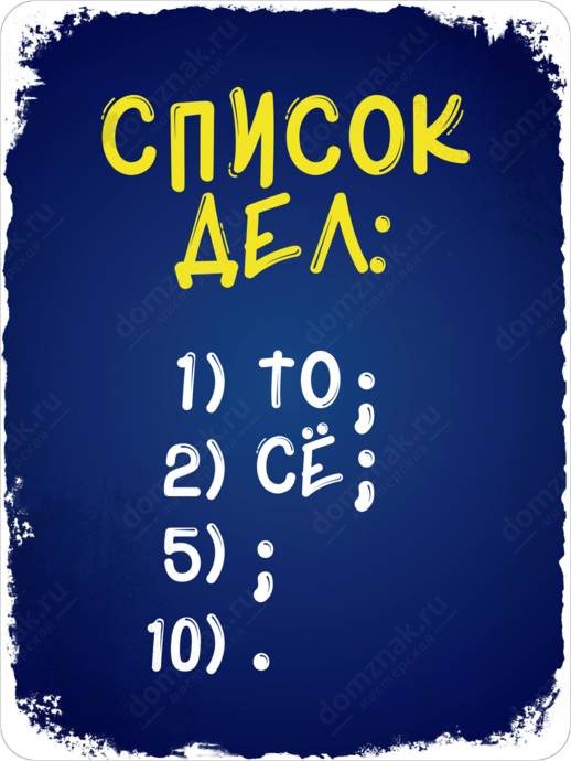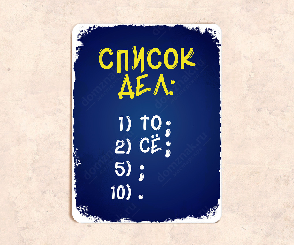 Табличка «Список дел» изготовлена из пластика ПВХ, толщиной 4 мм. Изображение наносится по технологии УФ-печати. Табличка предназначена для использования как в помещении, так и на улице.