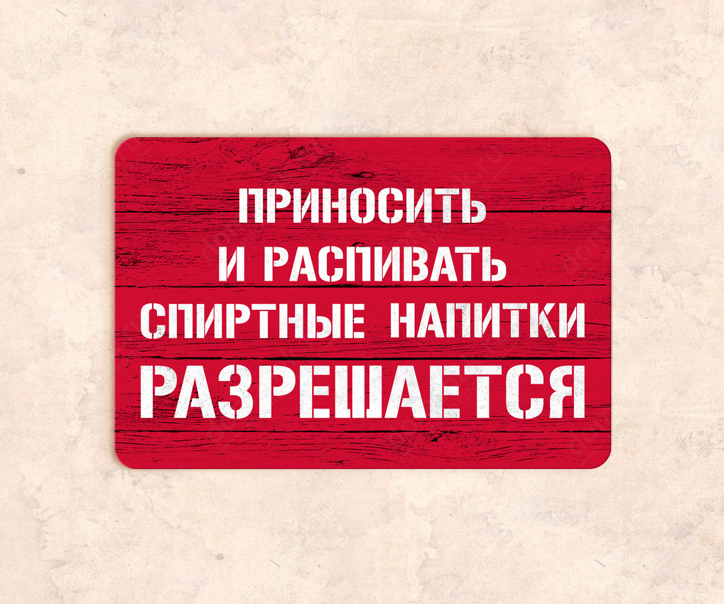 Табличка «Приносить и распивать спиртные напитки разрешается» изготовлена из пластика ПВХ, толщиной 4 мм. Изображение наносится по технологии УФ-печати. Табличка предназначена для использования как в помещении, так и на улице.