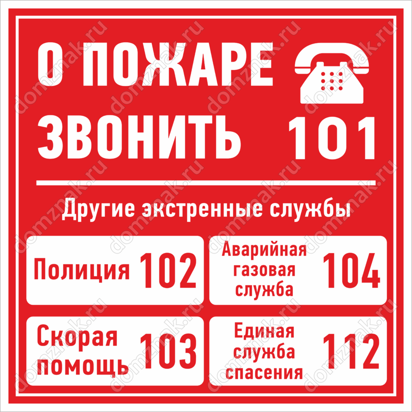 Знак «О пожаре звонить 101. Другие экстренные службы 102, 103, 104, 112» изготавливается в нескольких вариантах: