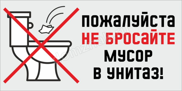 Табличка «Пожалуйста, не бросайте мусор в унитаз!» изготавливается на основе из пластика ПВХ или оцинкованного металла.