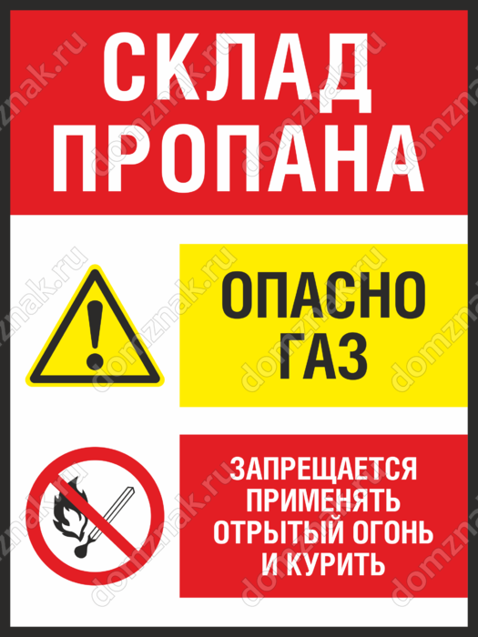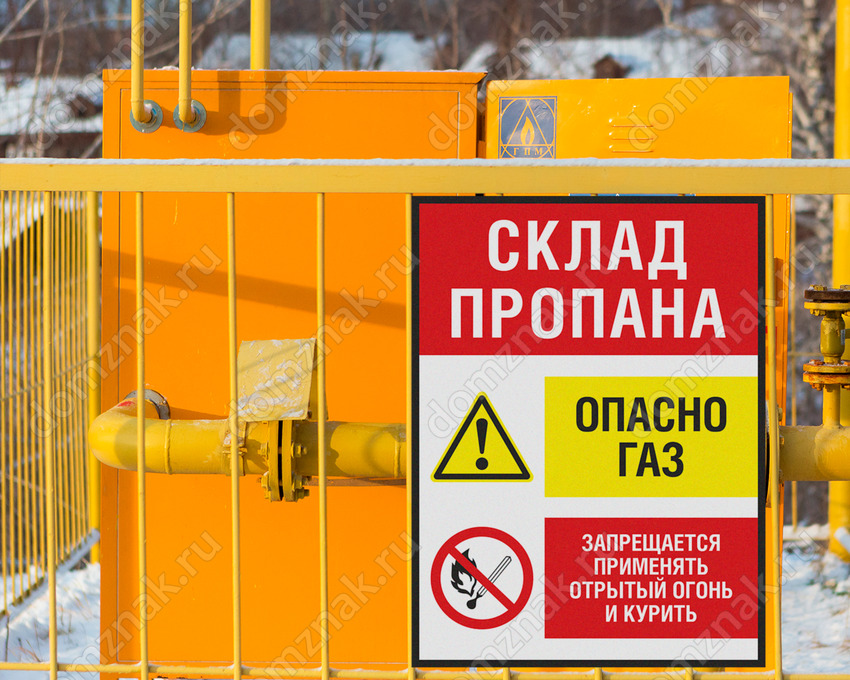 Знак «Склад пропана. Опасно газ. Запрещается применять открытый огонь и курить»