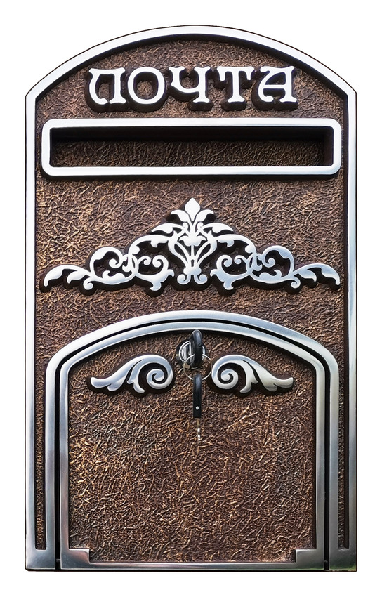 Почтовый ящик ПЯ-101 выполнен в сдержанном дизайне с небольшим количеством узоров, которые украшают дверцу и место над замочной скважиной. Шрифт "под старину" с засечками отлично вписывается в общий стиль изделия.
