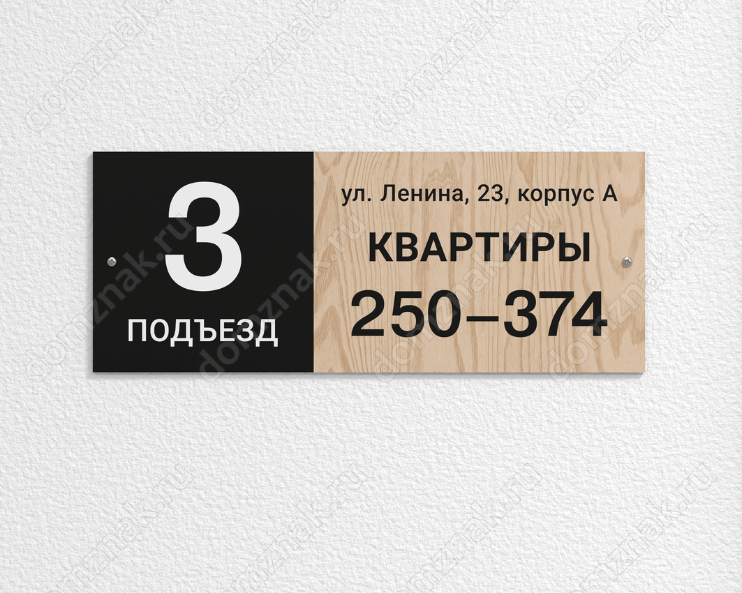 Компактная табличка содержит номера подъезда и расположенных в нем квартир – максимум необходимой информации на небольшом указателе. Такая табличка не требует много места для размещения, но при этом функциональна и привлекает внимание элегантным дизайном.