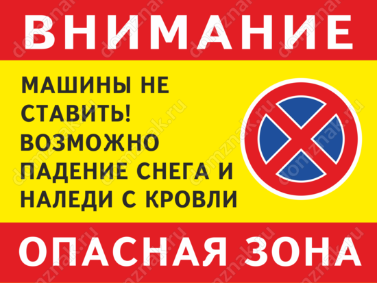 Предупредить людей об опасности, помочь сохранить здоровье, жизнь и имущество – функция знака «Машины не ставить – возможно падение снега или наледи». В качестве основного выбран яркий красный цвет – и это не случайно. Сигнализируя о риске, красная табличка привлекает внимание и обладает эффектом психологического воздействия. Звоните – мы обсудим Ваши пожелания и предложим Вам знаки парковки и движения для ЖКХ в полном соответствии с Вашими ожиданиями.
