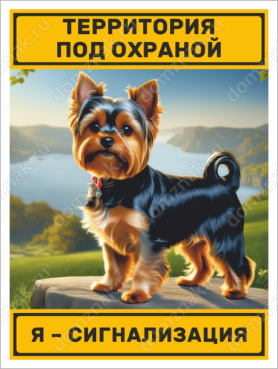 Табличка «Территория под охраной, Я - сигнализация», Йоркширский терьер изготавливается на основе из пластика ПВХ или оцинкованного металла.