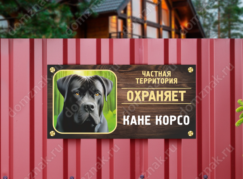 Табличка «Частная территория. Охраняет Кане Корсо» изготавливается на основе из пластика ПВХ или оцинкованного металла.