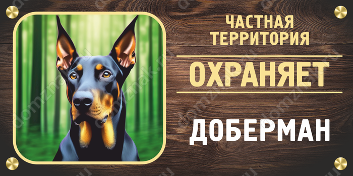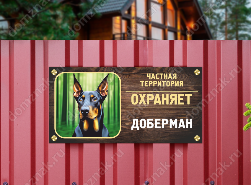 Табличка «Частная территория. Охраняет Доберман» изготавливается на основе из пластика ПВХ или оцинкованного металла.