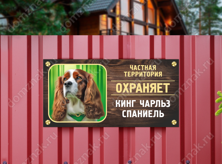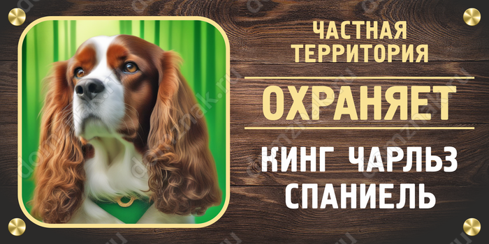 Табличка «Частная территория. Охраняет Кинг Чарльз спаниель» изготавливается на основе из пластика ПВХ или оцинкованного металла.