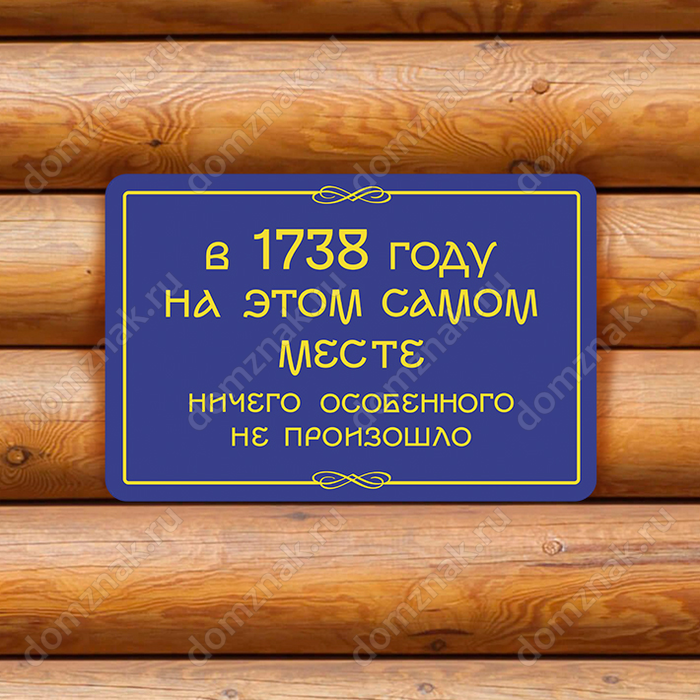 Табличка «В 1738 году на этом самом месте ничего особенного не произошло» изготовлена из пластика ПВХ, толщиной 4 мм. Изображение наносится по технологии УФ-печати. Табличка предназначена для использования как в помещении, так и на улице.