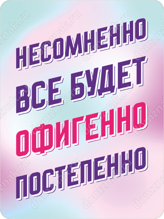 Табличка «Несомненно все будет офигенно постепенно» изготовлена из пластика ПВХ, толщиной 4 мм. Изображение наносится по технологии УФ-печати. Табличка предназначена для использования как в помещении, так и на улице.