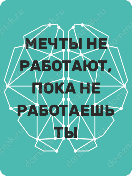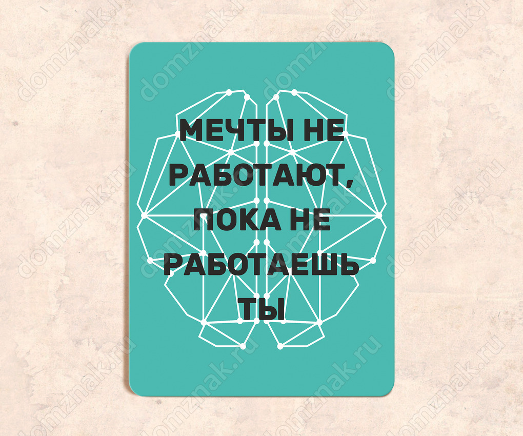 Табличка «Мечты не работают, пока не работаешь ты» изготовлена из пластика ПВХ, толщиной 4 мм. Изображение наносится по технологии УФ-печати. Табличка предназначена для использования как в помещении, так и на улице.