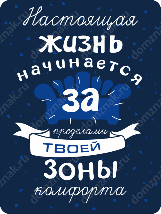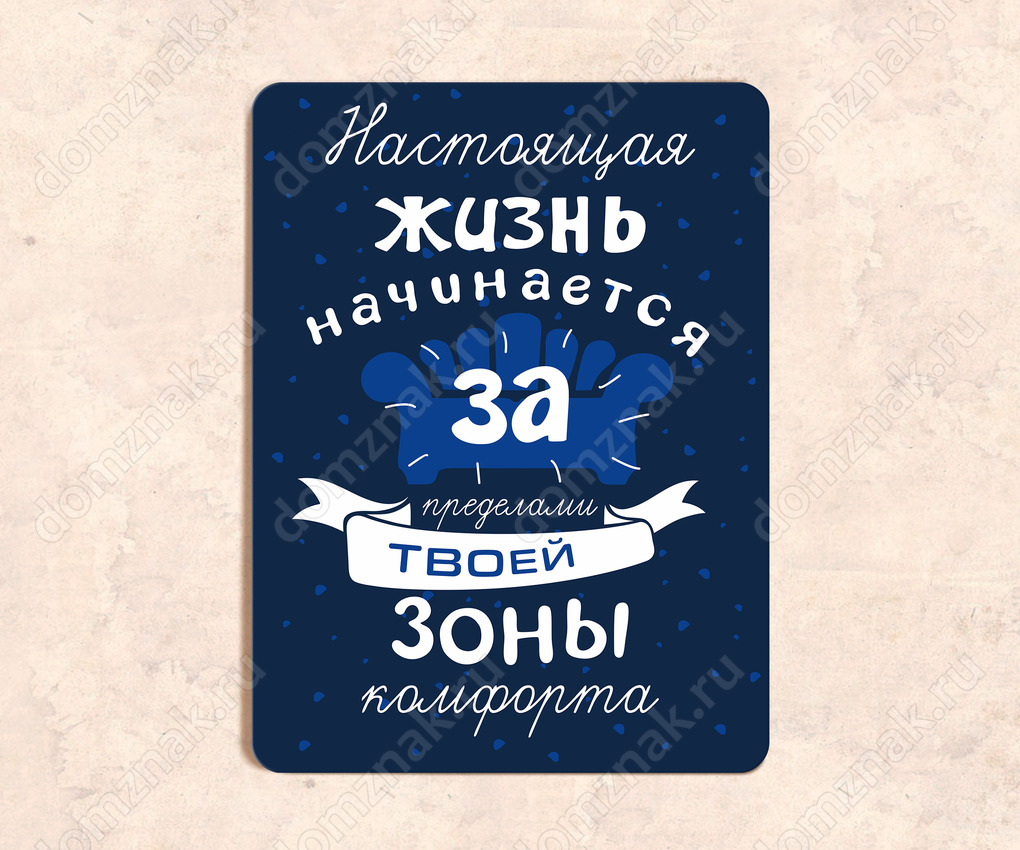 Табличка «Настоящая жизнь начинается за пределами твоей зоны комфорта» изготовлена из пластика ПВХ, толщиной 4 мм. Изображение наносится по технологии УФ-печати. Табличка предназначена для использования как в помещении, так и на улице.