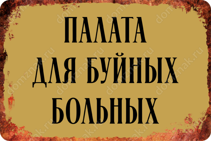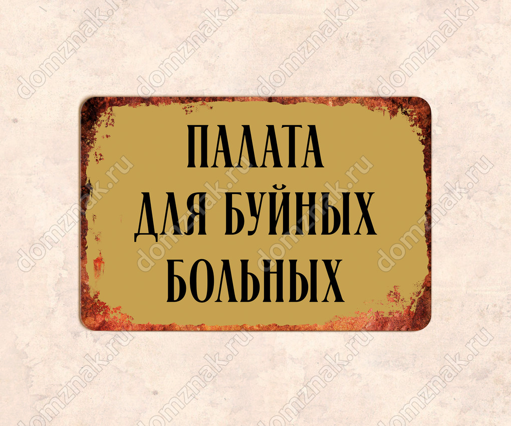 Табличка «Палата для буйных больных» изготовлена из пластика ПВХ, толщиной 4 мм. Изображение наносится по технологии УФ-печати. Табличка предназначена для использования как в помещении, так и на улице.