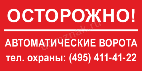 Установили автоматические ворота и хотите позаботиться об их сохранности и комфортной эксплуатации? Закажите табличку «Осторожно! Автоматические ворота» – благодаря ярко-красному фону такую табличку невозможно не заметить. Нет необходимости организовывать постоянно действующий контрольно-пропускной пункт с будкой для охранника? Разместите на табличке номер его телефона – это просто, удобно и недорого.