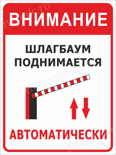 Автоматически работающий шлагбаум – источник повышенной опасности. Обеспечьте максимальную безопасность на вашей территории, предупредите о действующем шлагбауме, закажите стильную и качественную табличку «Внимание! Шлагбаум поднимается автоматически!». Благодаря яркому и продуманному дизайну, такая табличка привлечет внимание посетителей и поможет сохранить шлагбаум в целости и сохранности.